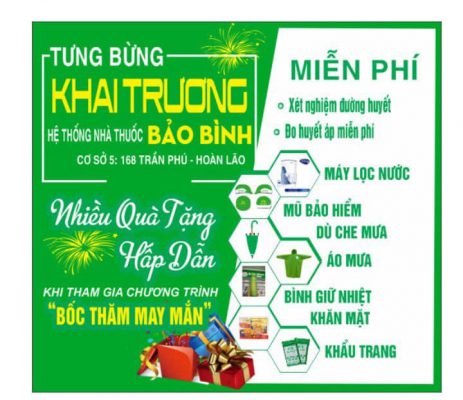 Nhân dịp khai trương cơ sở mới, nhà thuốc Bảo Bình đã triển khai nhiều chương trình khuyến mại đặc biệt để tri ân khách hàng, thực hiện chương trình thăm khám sức khỏe miễn phí như đo huyết áp, đo tiểu đường, khám dinh dưỡng miễn phí cho trẻ em, soi da và tư vấn chăm sóc da… Đặc biệt, nhà thuốc tổ chức chương trình bốc thăm trúng thưởng cho tất cả các khách hàng với tổng giá trị quà tặng lên đến hàng chục triệu đồng.